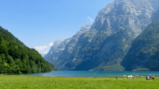 Die relativ enge Strasse entlang des Sees erfordert bereits die ersten geschickten Manöver, denn am Ende des Sees liegt ein gut besuchter Campingplatz und der Verkehr ist entsprechend. Dort gibt es auch das Restaurant Vorauen, wo man sich bei grandioser Aussicht stärken kann.