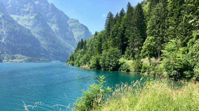 Unsere Fahrt beginnt in Netstal im Glarus, wo die Strasse ins Klöntal abzweigt. Bereits diese erste Auffahrt zum Klöntalersee beginnt mit einigen engen Passagen. Am Stausee angekommen, gönnen wir uns einen Halt, um die Postkartenszenerie des Klöntalersees zu geniessen.