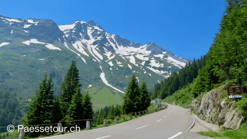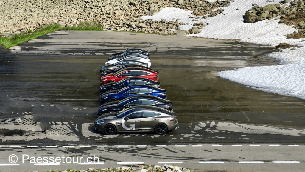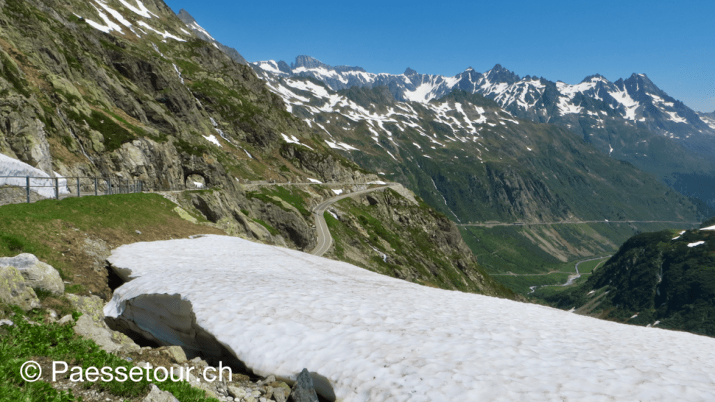 Kurz danach verschwinden wir kurz in einen Tunnel und befinden uns auf der anderen Seite auf Passhöhe, wo der Schnee gerne auch noch lange nach der Passöffnung im späten Frühling immer noch meterhoch liegt. Wir haben hier oben einige Gleichgesinnte getroffen.