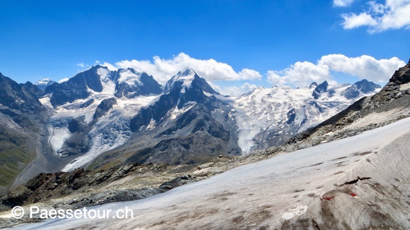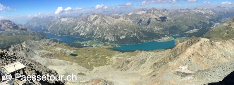 In Silvaplana nehmen wir die Seilbahn auf den Piz Corvatsch (3’303 m). Wir sehen den Rosegggletscher und die Seenplatte bis nach St. Moritz. Wir sehen auf der gegenüberliegenden Seite die Strasse über den Julierpass, den wir bei der folgenden Pässetour unter die Räder nehmen werden.