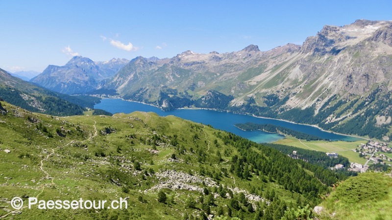 In Sils, etwas vor Silvaplana, nehmen wir die Seilbahn auf die Furtschellas (2’327 m). Von hier haben wir einen schönen Blick über den Silsersee bis zurück nach Maloja.