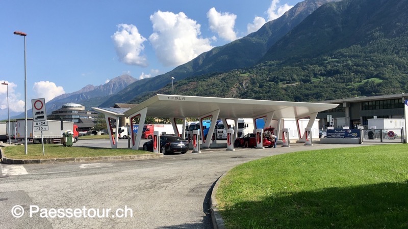 Bei Martigny stehen uns auf der Autobahnraststätte Relais St. Bernard diverse Lademöglichkeiten zur Verfügung, der Tesla Supercharger Martigny mit seinen 8 V2- und 8 V3-Ladestationen, mehrere Ionity-Ladestationen und weitere Chademo-, CCS- und Typ2-Ladestationen. In Martigny gibt es noch mehr Ladestationen.