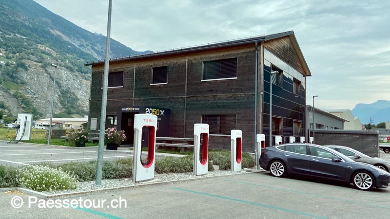 Bei Martigny stehen uns auf der Autobahnraststätte Relais St. Bernard diverse Lademöglichkeiten zur Verfügung, der Tesla Supercharger Martigny mit seinen 8 V2- und 8 V3-Ladestationen, mehrere Ionity-Ladestationen und weitere Chademo-, CCS- und Typ2-Ladestationen. In Martigny gibt es noch mehr Ladestationen.