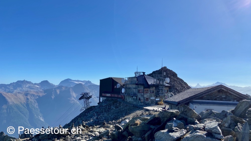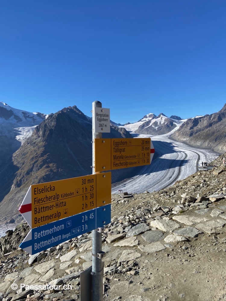 Wenn wir das Oberwallis noch ein wenig geniessen wollen, bieten sich viele Ausflüge von hier an. Eine halbe Stunde von Brig entfernt liegt Fiesch. Direkt im Bahnhofsgebäude liegt die Talstation der Bahn auf das Eggishorn. Sie bringt uns in gut 30 Minuten auf das Eggishorn (2’867 m), von wo wir einen bombastischen Blick auf den Aletschgletscher, den Konkordiaplatz, das Jungfraujoch und sogar zum Matterhorn haben.
