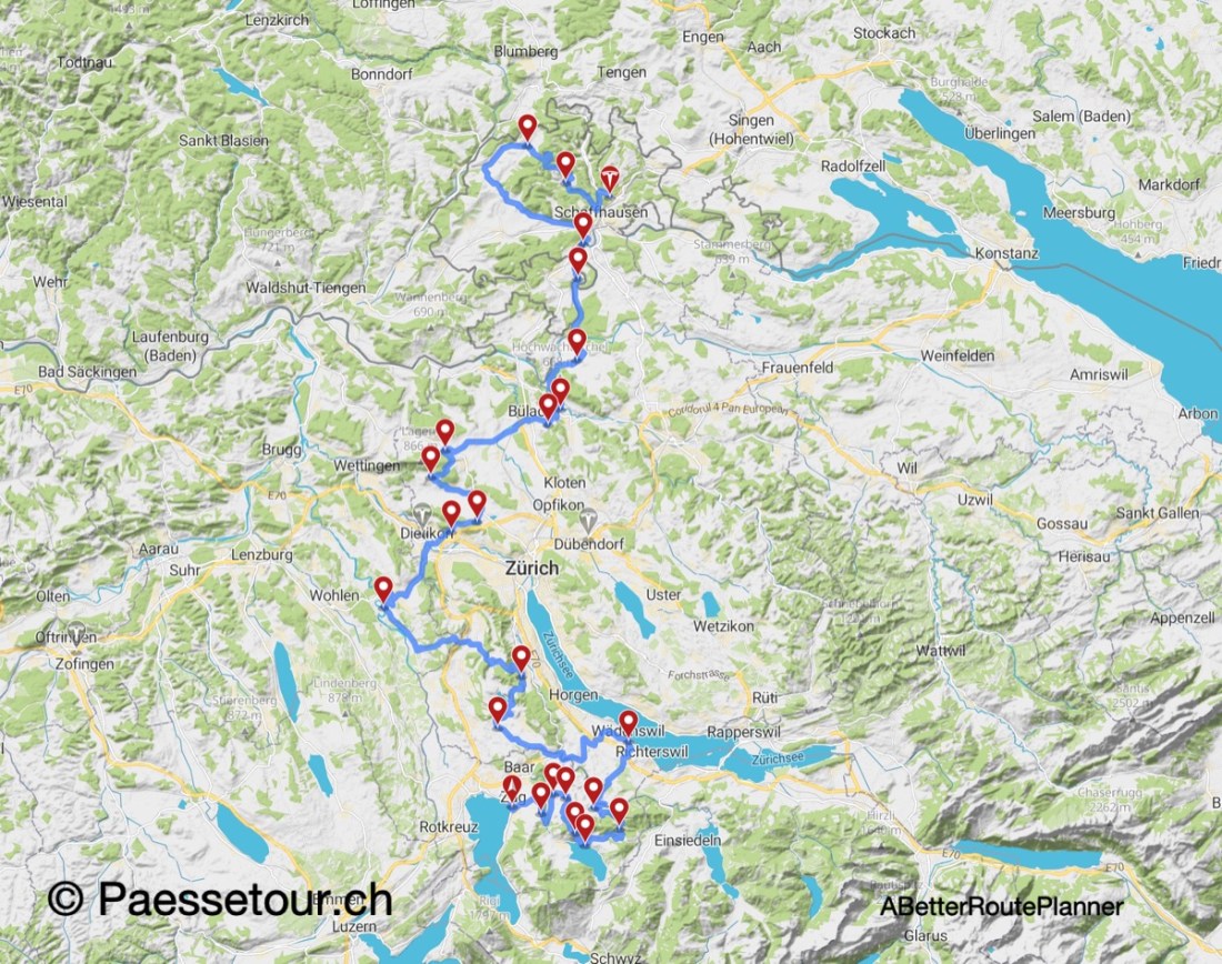 Wir erleben auf dieser 7-Pässetour der Tour of Swiss Mountains 6'483 Höhenmeter über 203 Kilometer und benötigen hierfür eine theoretische Fahrzeit von 5:13 Stunden. Wir überqueren die Bergpässe Gottschalkenberg, Hirzel, Hirzel Höhi, Albis, Buchenegg, Mutschellen, Siblingerhöhe und Randenüberfahrt. Zusätzlich überqueren wir den Zuger Kistenpass, Islisberg, Weiningerpass, Regensberg und Dättenberg. Wir machen Pause am Seleger Moor, in Bremgarten, in Rheinau, am Rheinfall in Neuhausen und lassen diese Pässetour in Schaffhausen ausklingen.