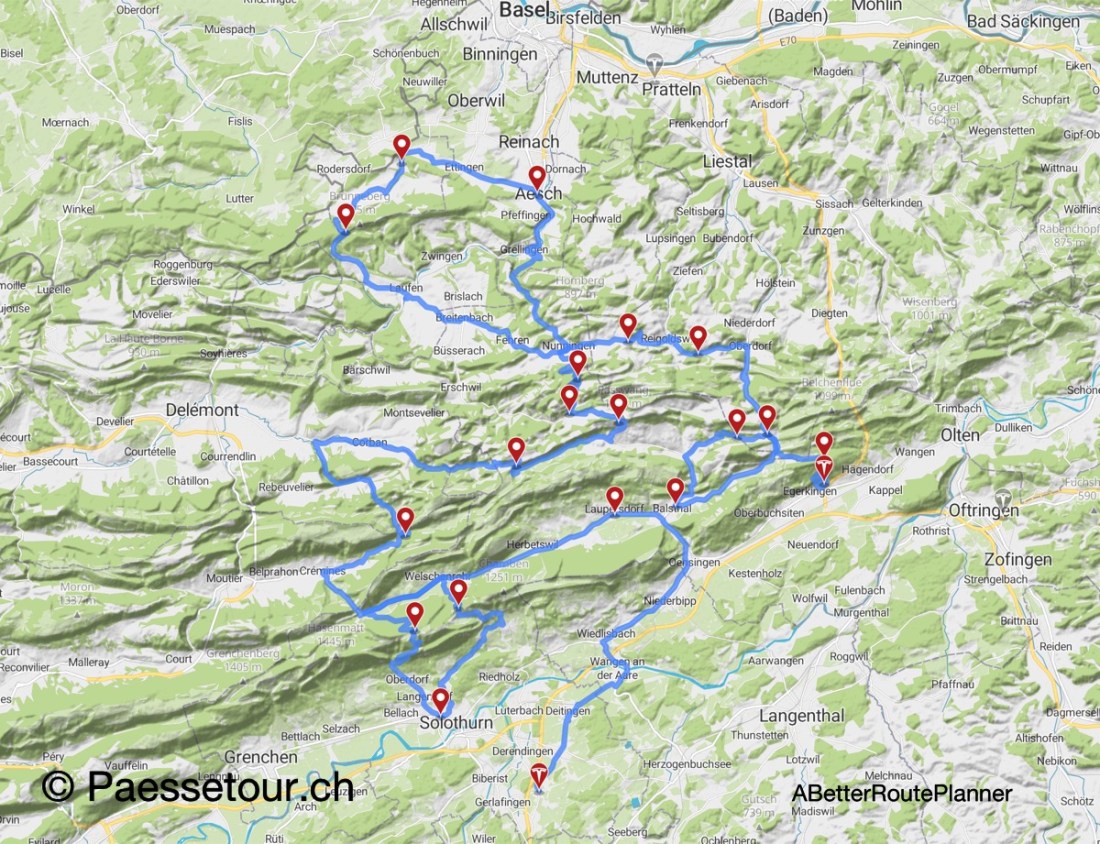 Wir erleben auf dieser 9-Pässetour der Tour of Swiss Mountains 8'650 Höhenmeter über 214 Kilometer und benötigen hierfür eine theoretische Fahrzeit von 5:17 Stunden. Wir überqueren die Bergpässe Santelhöchi, Breitenhöchi, Oberer Hauenstein, Eichhöhe, Challpass, Passwang, Schelten, Balmberg und Weissenstein. Zusätzlich überqueren wir das Sixfeld und den Nunningerpass sowie durchqueren Grändel. Wir besichtigen Laufen und lassen diese Pässetour in Solothurn ausklingen.
