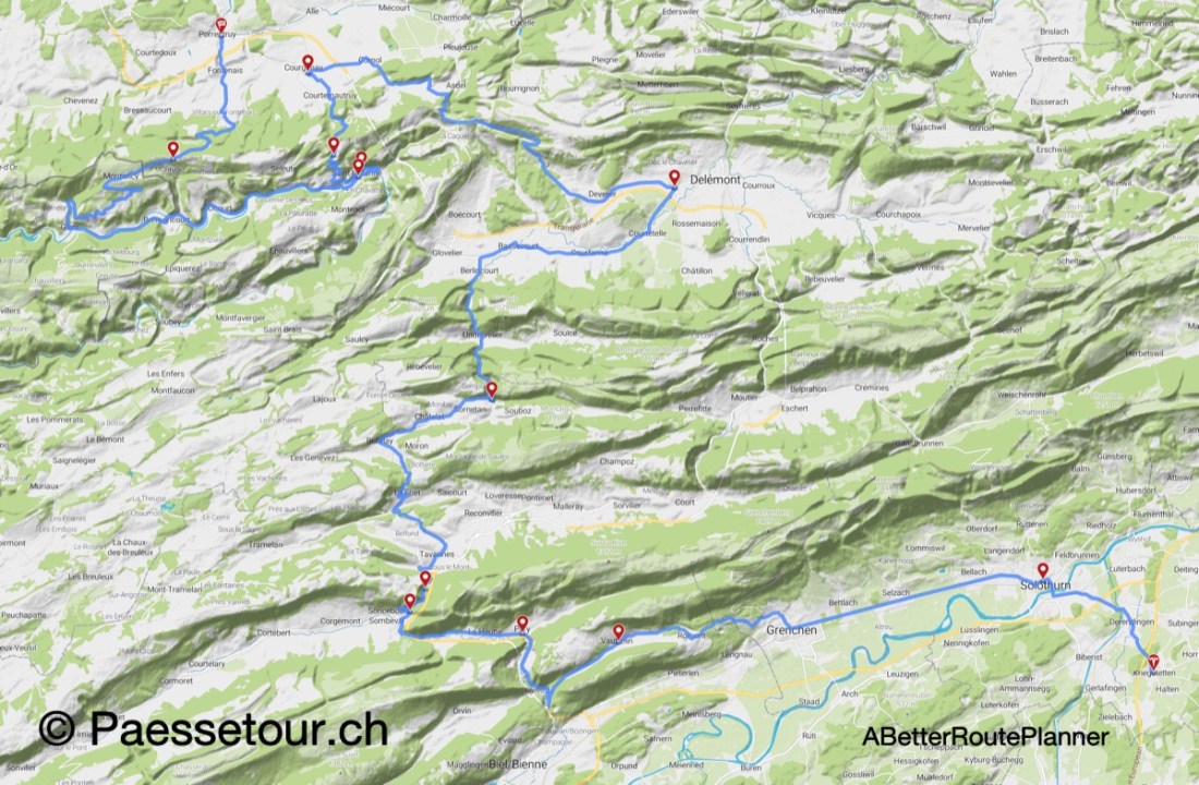 Wir erleben auf dieser 4-Pässetour der Tour of Swiss Mountains 3'785 Höhenmeter über 136 Kilometer und benötigen hierfür eine theoretische Fahrzeit von 2:56 Stunden. Wir überqueren die Bergpässe Col de Pierre Pertuis, Col des Rangiers, Col de la Croix und Col de Montvoie. Wir durchqueren Vauffelin und Bellelay und zwängen uns durch die Gorges du Pichoux. Wir geniessen zu Beginn einen fantastischen Blick vom Obergrenchenberg. Wir besichtigen Delemont und St-Ursanne, die Perle des Jura, und lassen diese Pässetour in Porrentruy ausklingen.