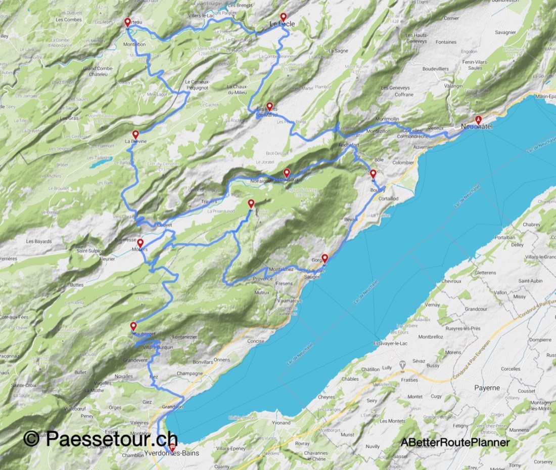 Wir erleben auf dieser 2-Pässetour der Tour of Swiss Mountains 5'369 Höhenmeter über 161 Kilometer und benötigen hierfür eine theoretische Fahrzeit von 3:34 Stunden. Wir überqueren dabei die Bergpässe La Tourne und Col des Roches. Zusätzlich überqueren wir den Mont Gaudichot, Mont Brenin und La Tourmande. Wir erleben überwältigenden Blicke in die Tiefe des Creux du Van und über den Neuenburgersee.