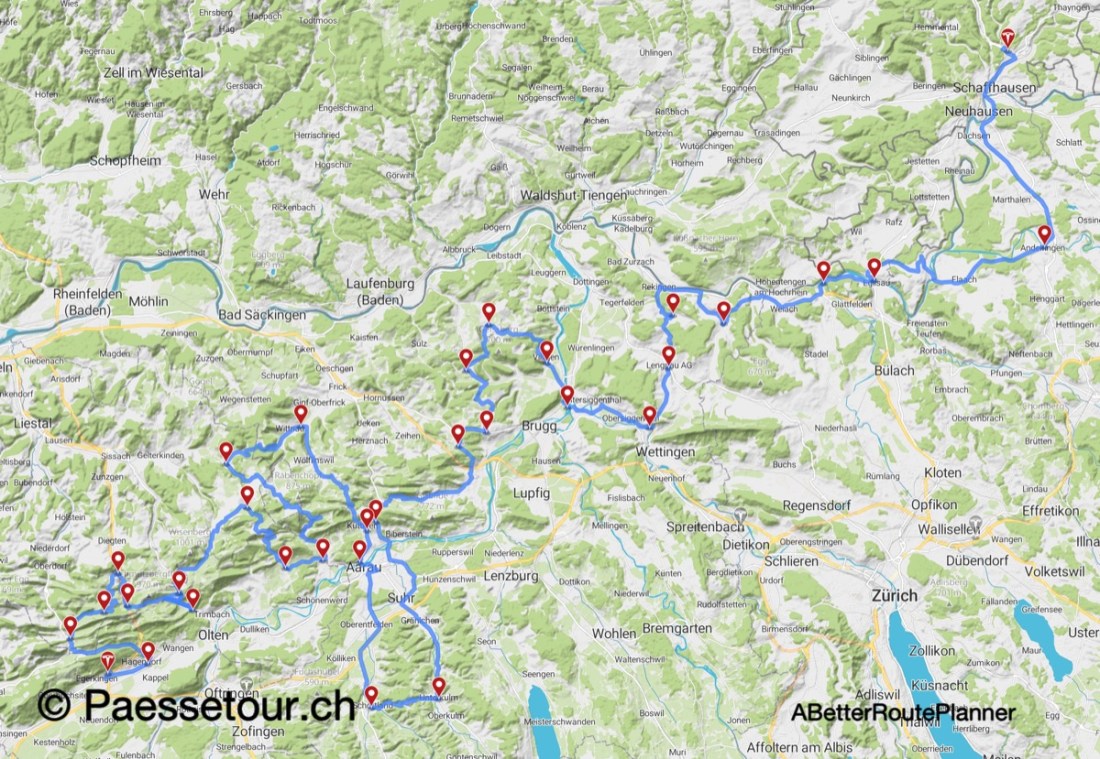 Wir erleben auf dieser 10-Pässetour der Tour of Swiss Mountains 7'366 Höhenmeter über 246 Kilometer und benötigen hierfür eine theoretische Fahrzeit von 5:44 Stunden. Wir erleben auf die Bergpässe Bürersteig, Bözberg, Staffelegg, Böhlerpass, Benkerjoch, Saalhöhe, Schafmatt, Unterer Hauenstein, Challhöchi und den Chilchzimmersattel. Zusätzlich überqueren wir den Belchen, Baldingerberg, Zurzacherberg und den Buschberg. Pausen legen wir ein am Rheinfall, am Naturschutzgebiet Klingnauer Stausee, am Wasserschloss der Schweiz und der Linner Linde.