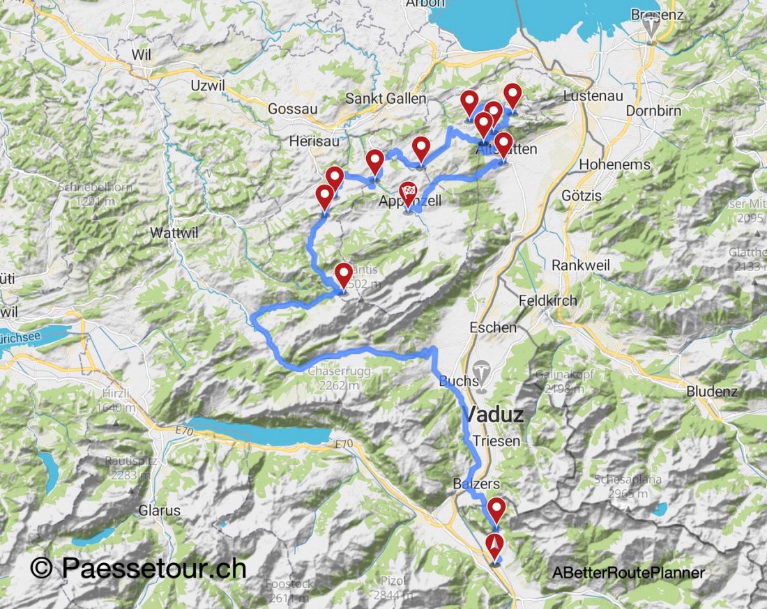 Wir erleben auf dieser 7-Pässetour der Tour of Swiss Mountains 5'790 Höhenmeter über 157 Kilometer und benötigen hierfür eine theoretische Fahrzeit von 3:30 Stunden. Wir überqueren die Bergpässe St-Luzisteig, Wildhaus, Schwälp, Wissegg, Ruppen, St-Anton, Stoos und überqueren zusätzlich Triesenberg mit einer traumhaften Aussicht über das Rheintal. Wir lassen diese Pässetour im lieblichen Appenzellerland ausklingen.